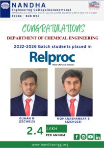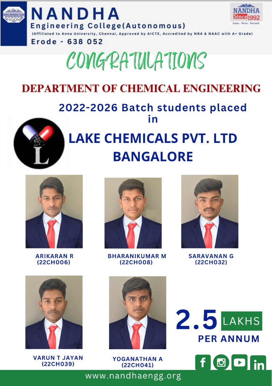 The Department of Chemical Engineering at Nandha Engineering College was established in 2017, with a vision of academic excellence and a commitment to contributing to societal and industrial needs through research. Our goal is to provide students with a balance of intellectual and practical experiences that enable them to serve various societal needs, particularly in rural communities. We have vibrant students and young and dynamic faculty whose expertise spans a wide range of disciplines within the Chemical Science and Engineering stream. Our department fosters a healthy work culture that aims to equip students to become successful employees or entrepreneurs in their chosen fields.
