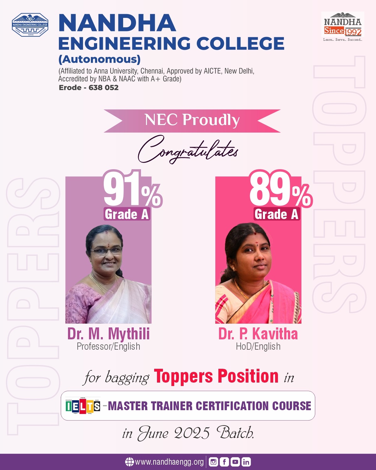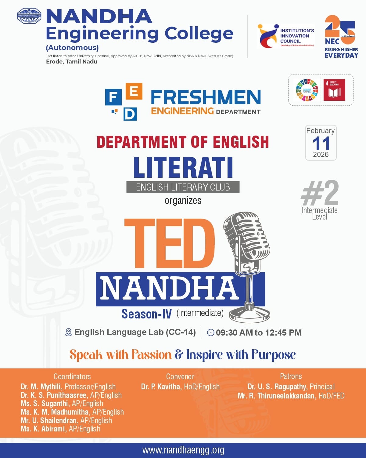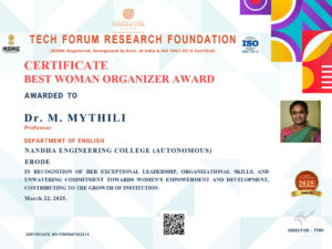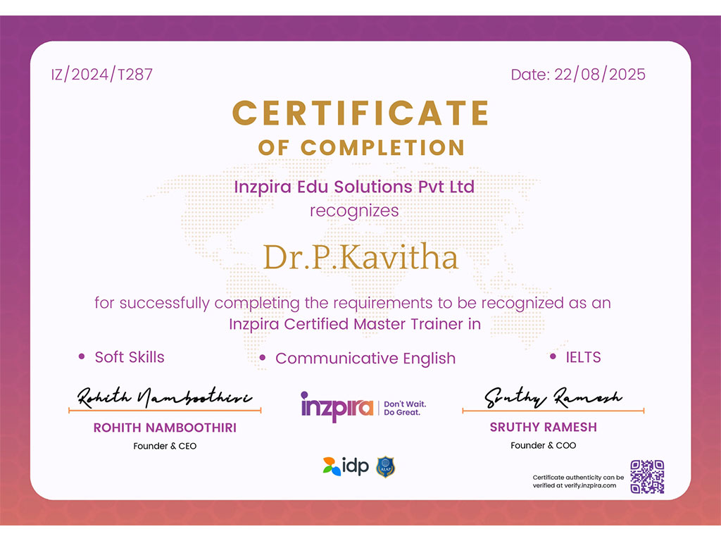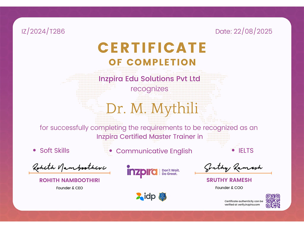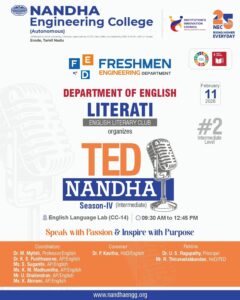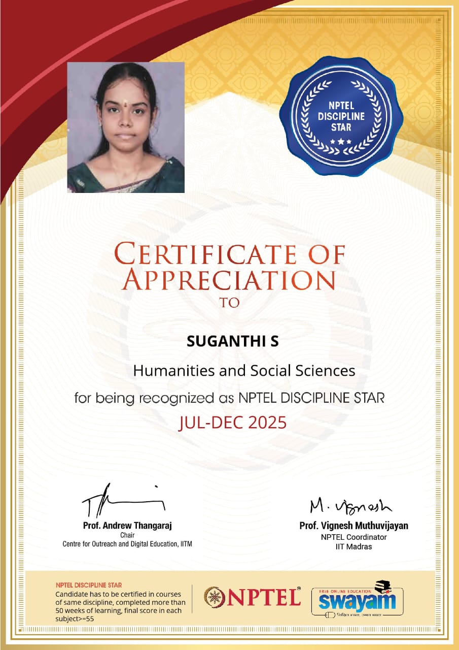The Department of English is instrumental in shaping globally competent engineers through advanced training in communication and professional soft skills. With a strong focus on placement preparedness, the department enhances linguistic proficiency and interpersonal effectiveness. It regularly hosts seminars, workshops, ice-breaking sessions, and TED-Talk contests to enhance confidence and articulate expression. By bridging technical knowledge with eloquent communication, the department empowers students to excel in both academic and corporate landscapes. The department stands as a catalyst for personal transformation and professional success.